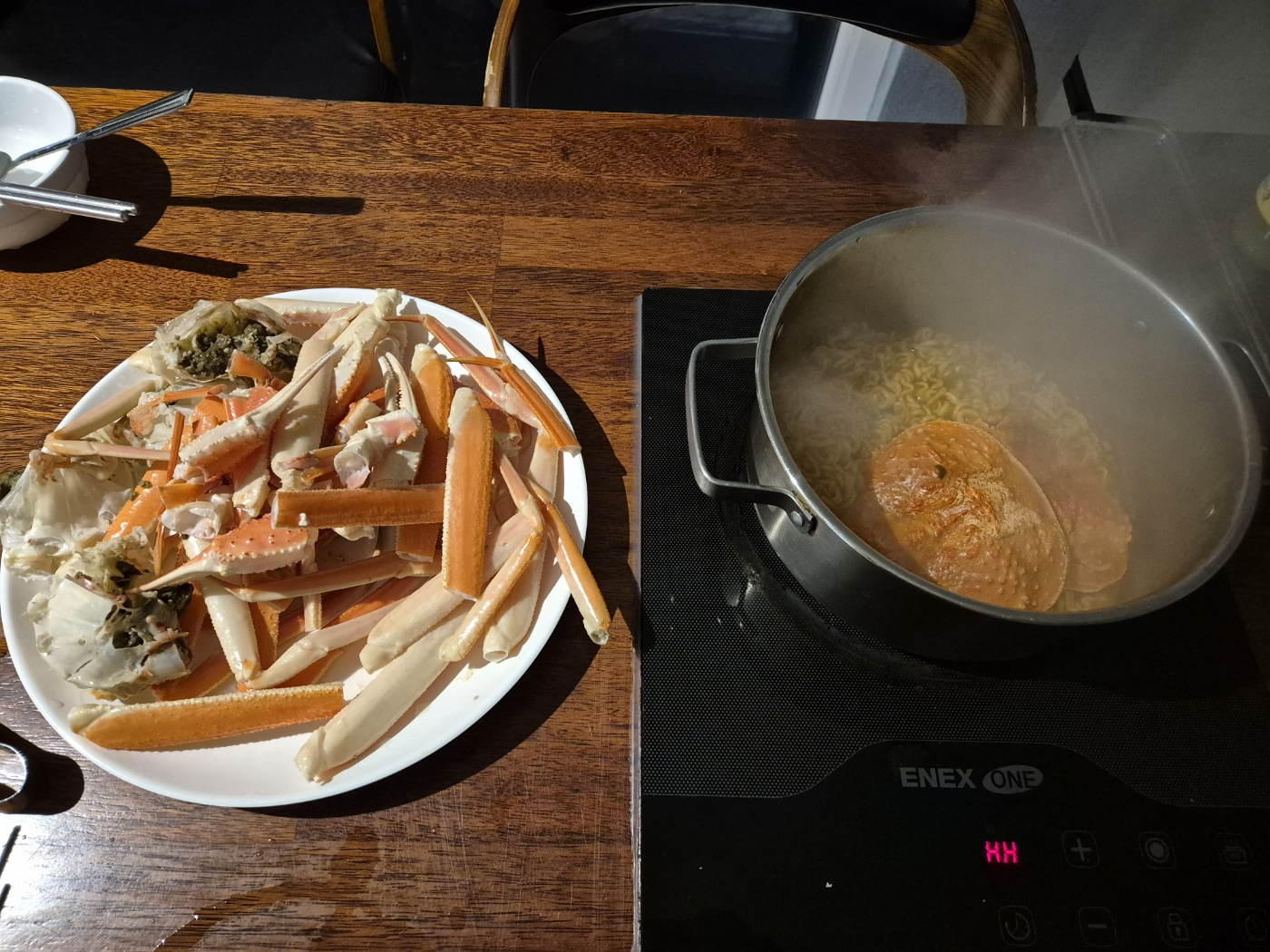 숙소에서 쪄온 대게 + 라면 1개를 끓여서 함께 먹었어요.